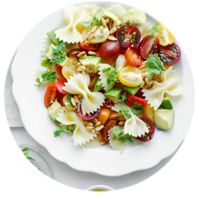Tomate, farfalle, aguacate, mozzarella de búfala, piñones. (Vinagreta de Mostaza)